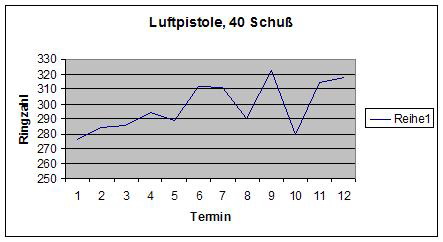 Ein, zugegeben, mehrdeutiger Titel. ;-) Zuwächse kann ich hinsichtlich meiner Leistungen mit der Luftpistole vermelden. Im bis dato besten 40-Schuß-Programm, geschossen am 7. August, kam ich auf 322 Ringe; die besten 10er Serien lagen bei 85 Ringen. Das ist gewiß nicht überwältigend, aber für meine bescheidenen Anfänge doch schon viel. Die Leistungsentwicklung seit der Umstellung auf die internationale LP-Scheibe und zugleich den neuen FWK ist im obigen Diagramm dargestellt (die Ausschläge nach unten haben etwas mit meiner psychischen Form an den betreffenden Tagen zu tun).